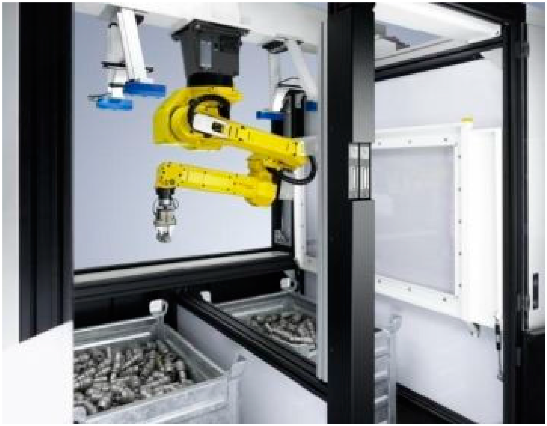 Projected texture stereo vision technique is mainly used in bin picking applications [76,77]. The task of picking random and unsorted objects from a container or a storage bin presents a number of different challenges. A fast and reliable identification of one or several objects is required in terms of shape, size, position and alignment (Figure 15). This information must be obtained and passed on to the robot controller, which is essential to the ad hoc generation of collision-free robot paths. This is the starting point for the use of robots in handling processes.