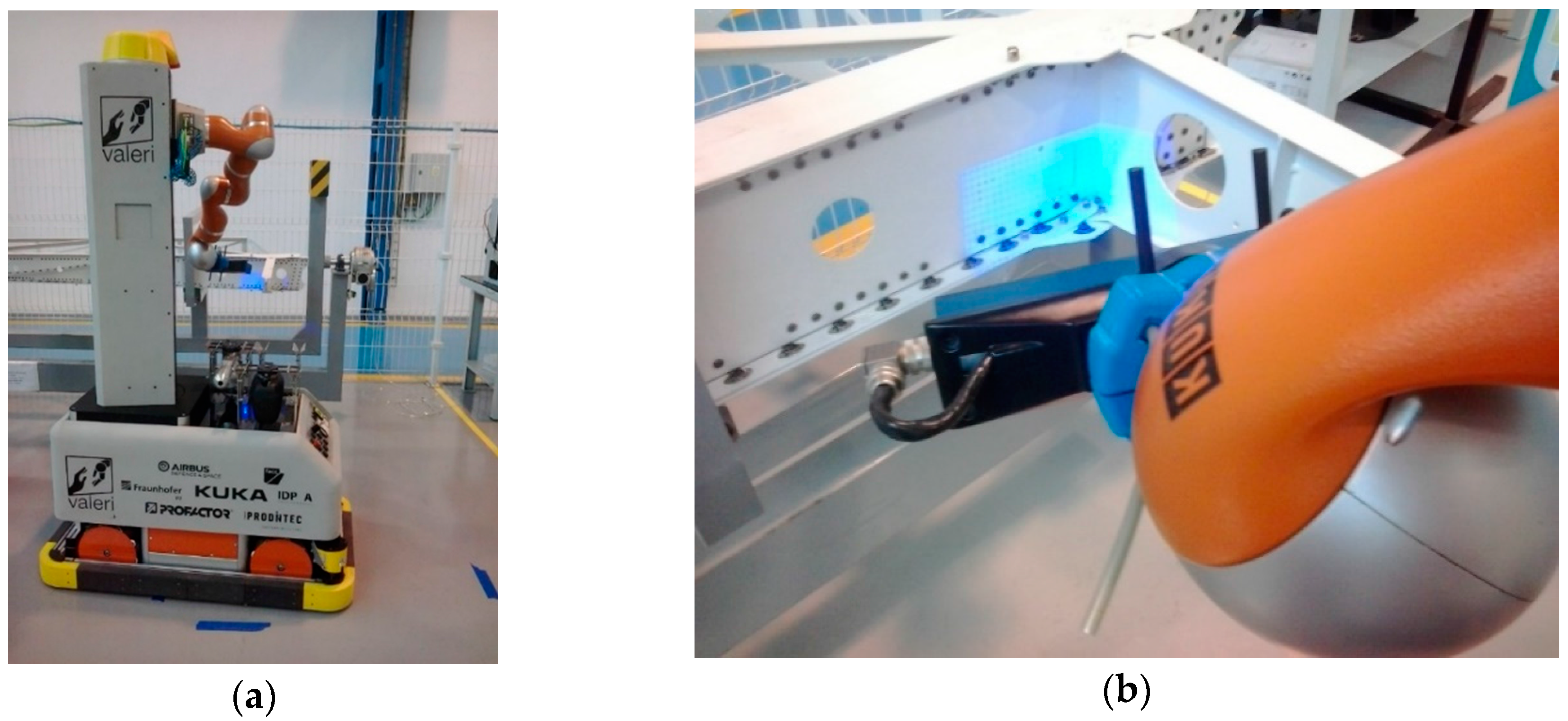 Industrial robots are able to move to a position repeatedly with a small error of 0.1 mm, although their absolute accuracy can be several mm due to tolerances, eccentricities, elasticities, play, wear-out, load, temperature and insufficient knowledge of model parameters for the transformation from poses into robot axis angles [17,18,19]. In the automotive industry the accuracy requirement for operations such as spot welding will be of the order of 1 mm. The aerospace industry provides a challenging environment to apply robotics as its accuracy requirements are at least a factor of ten- to twenty-fold higher [20]. Conventional robots are not capable of achieving this accuracy. To improve the accuracy, optical calibration methods, such as laser tracker systems, photogrammetry or vision systems with multiple high resolution cameras, are used to detect the spatial position of the tool tip and to correct the robot motion. The combination of a measurement system with a robot is an optimal solution as it makes use of the robot ability for precise movement and overcomes the accuracy deficiencies. Moreover, working parts can be positioned slightly different from what the robot is expecting. In order to successfully navigate a mobile robot, obtaining detailed information on its immediate environment is the main concern. If the collected data is correct and sufficiently detailed, the creation of a 3D appearance model is possible and developers are given the opportunity to create accordingly sophisticated navigation software.