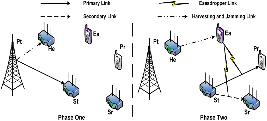Just like traditional wireless networks, security is one of the fundamental concerns in CIoT networks [] (unless otherwise specified, the CIoT networks mentioned below refer to spectrum-leasing-based CIoT networks). The primary user has the requirement to prevent the eavesdropping attack (there are many different attack modes, such as denial-of-service (DoS) attacks, replay attacks and eavesdropping attacks; in this paper, we pay attention to the eavesdropping attack). In order to achieve secure transmission, physical (PHY) layer security, which exploits the characteristics of the radio spectrum to limit the amount of information extracted by eavesdroppers, has been proposed [,,,,,,]. Compared to the traditional encryption methods in the upper layer, physical layer security has its advantages [,]. In CIoT networks with low-complexity devices, some issues are raised in upper layer security, such as key distribution for symmetric cryptosystems and the high computational complexity of asymmetric cryptosystems []. Different from upper layer security, physical layer security schemes enable secret communication without the aid of an encryption key. Meanwhile, the computational complexity of physical layer security schemes is low []. Moreover, all encryption methods are based on the assumption that it is computationally infeasible for the eavesdropper since the computing capacity of the eavesdropper is limited []. However, this assumption is not suitable due to the growth of computational power. For physical layer security, no limitations are assumed for the eavesdropper in terms of computational resources. For the above reasons, physical layer security is more suitable for CIoT networks. Considering that CIoT networks are cooperative networks, it is a logical idea to employ cooperation techniques in physical layer security to improve the security capability. One of the cooperation techniques is cooperative jamming, and it has been widely studied in other networks [,,]. The main idea of cooperative jamming is to generate an artificial noise via multiple antennas on a cooperative helper (such as a secondary user) to confuse the eavesdropper.