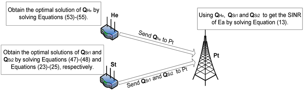 To promote better understanding of the proposed jamming scheme, as shown in Figure 2, we take a simple case with a relay and a helper . With the purpose of deteriorating the SINR at , should choose optimal solutions of and . The optimal solution of can be obtained by Equations (23)–(25). Similarly, the optimal solution of can be obtained by Equations (47) and (48). As for , it should choose the optimal solution of , and this optimal solution can be obtained by Equations (53)–(55). Using the optimal solutions of , and , the minimum SINR at can be obtained by Equation (13).