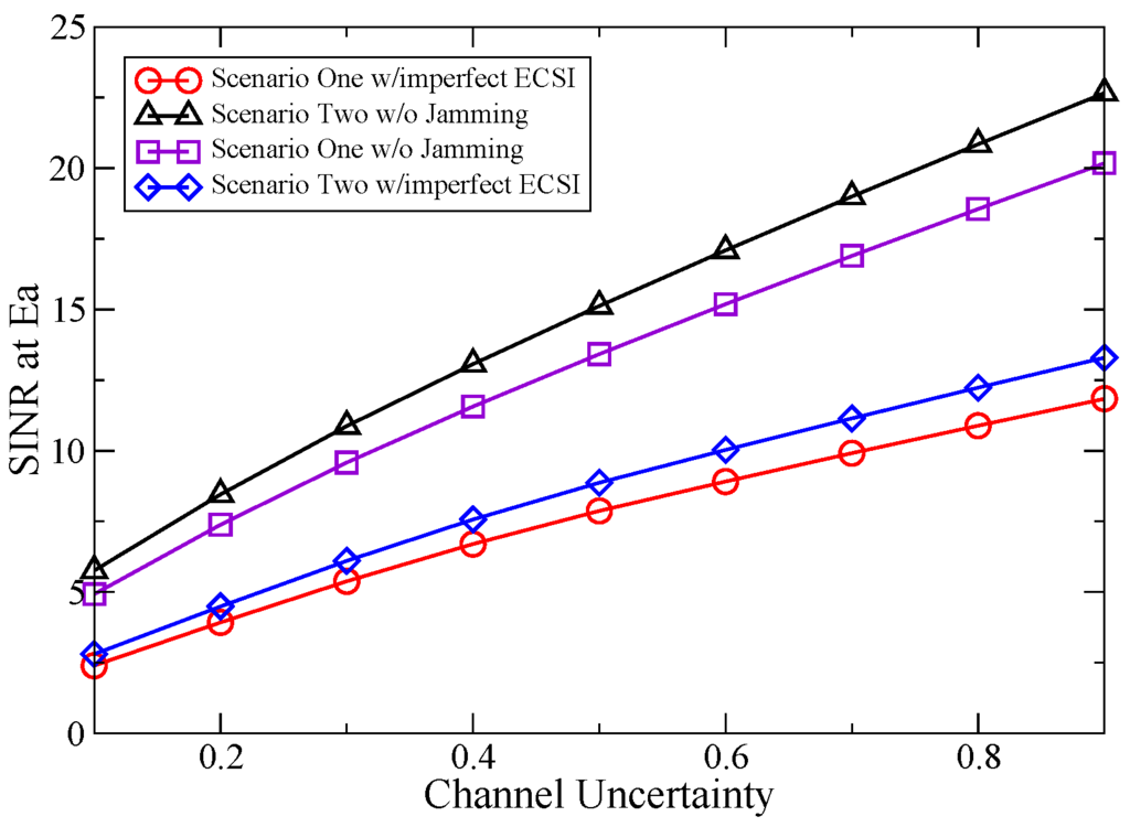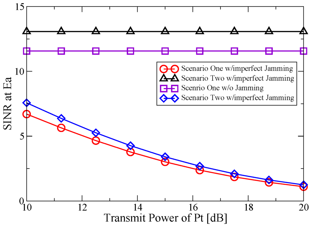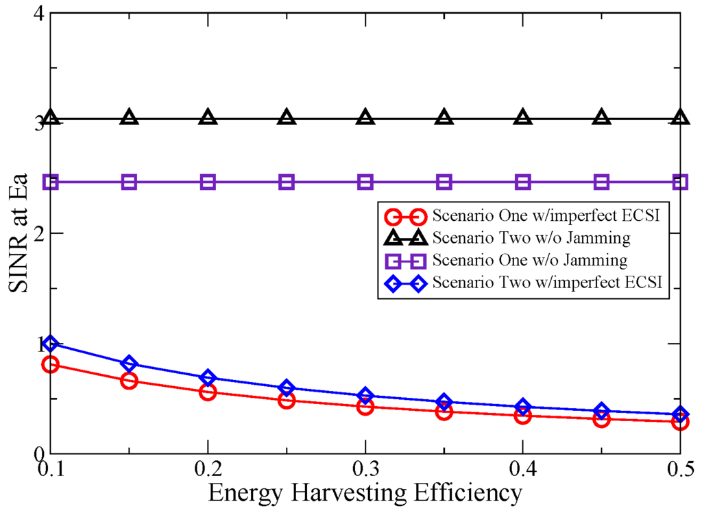 The impact of the energy harvesting efficiency on the SINR at Ea is presented in Figure 5. As shown in Figure 5, the security capability is greatly influenced by the energy harvesting efficiency. With the increase of the energy harvesting efficiency, more transmit power can be seized by , which leads to a more effective performance. Note that the conversion efficiency is not enough in the experimental measurement [], resulting in a high power cost at . However, with the improvement of hardware, the conversion efficiency is expected to be increased in the near future. One can also find that the increase of the energy harvesting efficiency leads to a smaller gap between Scenario One and Scenario Two in the proposed jamming scheme. The reason is that a stronger jamming signal reduces the impact of the secondary traffic that is eavesdropped by .