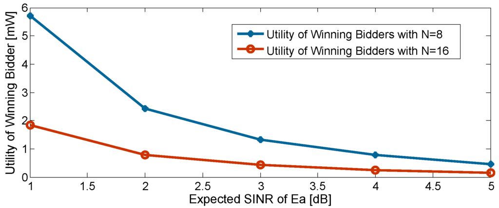 Figure 6 shows the utility value of the winning bidder as a function of the expected SINR at . It is obvious that the utility value of the winning bidder is positive. This result is expected and confirms the theoretical analysis in Section 5.2. Additionally, a large number of secondary users leads to a smaller utility of the winning bidder. This can be explained as with the increased number of secondary users, the second-lowest bid is more likely to be close to the lowest bid. Furthermore, one can find that a smaller expected SINR at leads to an increase of the utility of the winning bidder. This is because the primary user needs to spend more energy to fulfill its stringent requirement of ’s SINR. On the other hand, as can be seen in Figure 6, a higher expected SINR at may cause a no-winner result, regardless of the number of secondary users. In other words, the utility value of the winning bidder tends to be zero. This is because the second-lowest bid is more likely to be close to the lowest bid (winning bid) under a low standard requirement.