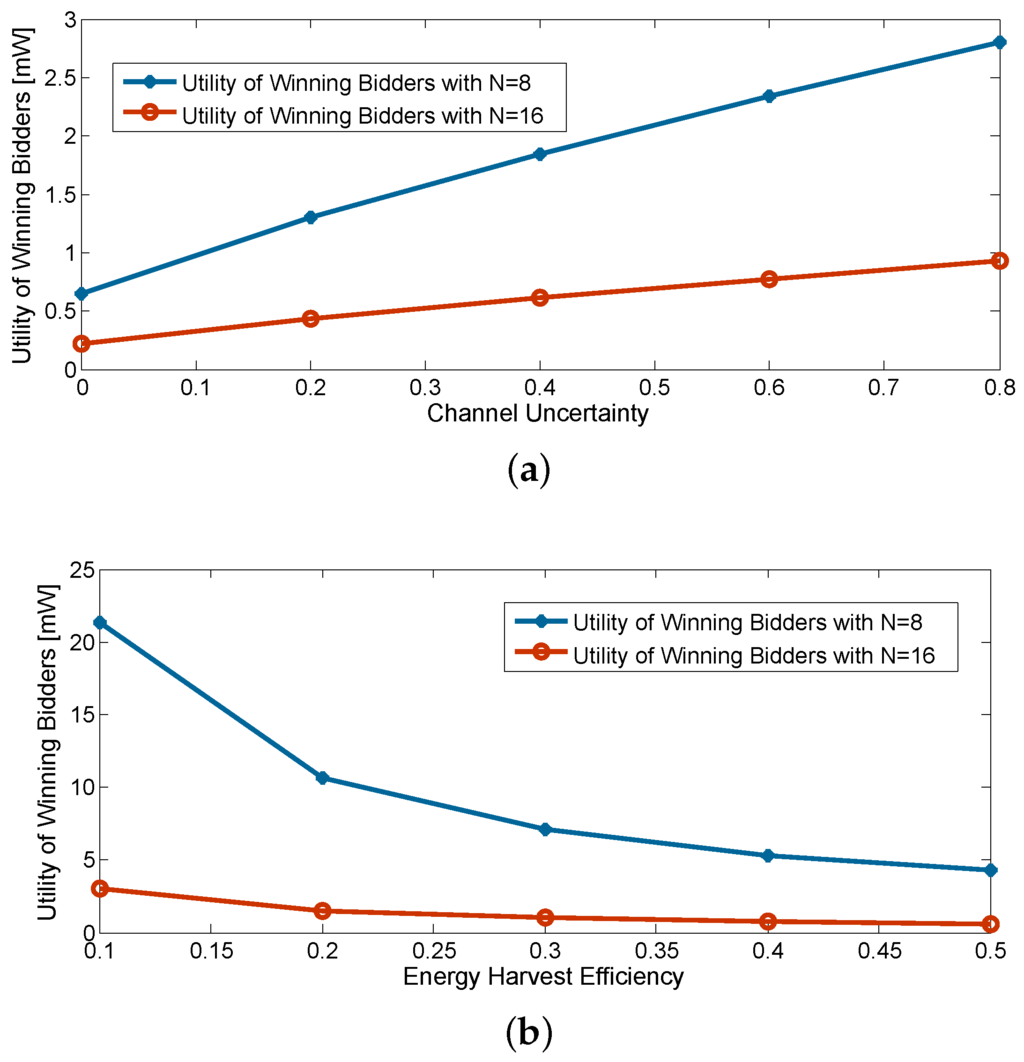 Figure 7 reports the impacts of the channel uncertainty and the energy harvest efficiency on the utility of winning bidder. The expected SINR at is set to be 0 dB. The utility is observed to be increased under a lower energy harvest efficiency and a bigger channel uncertainty. In the case of low energy harvest efficiency, the secondary users require more energy provided by . With different channel conditions, the lowest bid is more likely to be far from the second-lowest bid. Additionally, so is the large channel uncertainty. Note that the utility of the winning bidder also reduces as the number of the secondary users increases. This can be understood by the fact that as the number of bidders rises, the gap narrows between the second lowest bid and the lowest bid (winning bid).