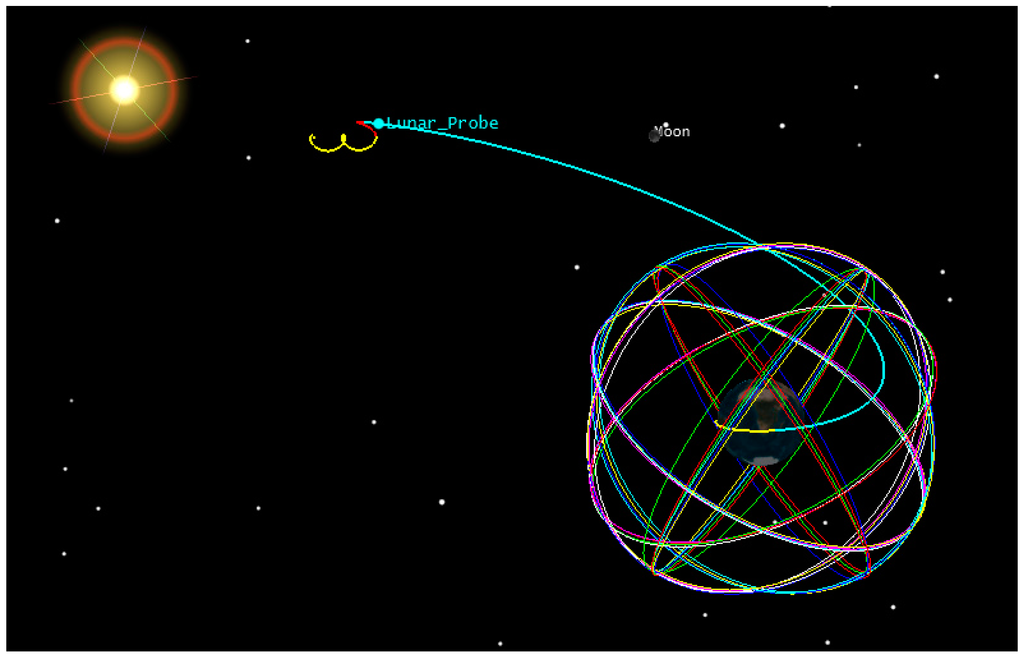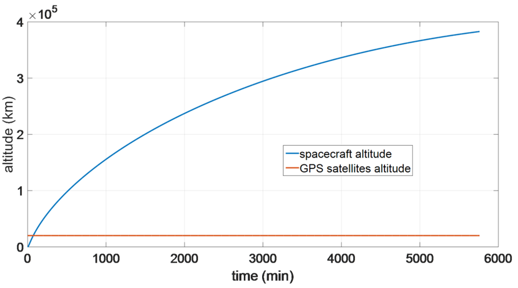 The reference trajectory for our study is a direct Earth-Moon Transfer Orbit (MTO). The initial position and velocity with the respect to the Earth Centered Inertial frame (ECI) are reported in Table 1, as well as some characteristics assumed for the host spacecraft. The full trajectory is propagated from the initial conditions by the PosApp software of our Spirent GSS8000 simulator, taking into account gravitational effects from the Earth, Sun and Moon, atmospheric drag and the solar radiation pressure. The reference trajectory is represented by the blue portion of the MTO shown in Figure 2. The reference orbit has been validated using the System Tool Kit (STK) [20]. Figure 3 shows the relation between altitude and time during the considered MTO and also the GPS satellites altitude.