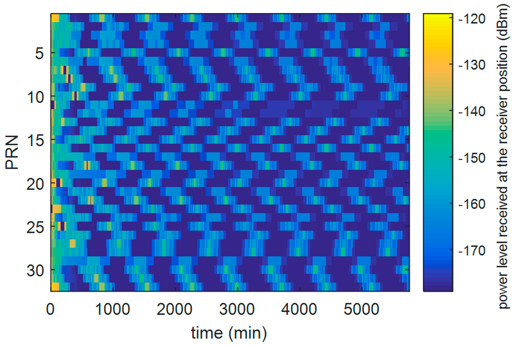 In our simulations we have modelled a GPS constellation consisting of 32 GPS satellites, allocated in the six orbital planes according to [21]. Realistic GPS L1 C/A signals are generated by our Spirent GSS8000 full constellation simulator, where the signal power level at the receiver is modelled as [22]: