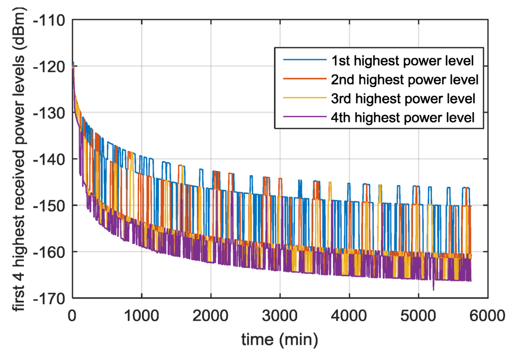 First, second, third and fourth highest received power levels of the GPS L1 C/A signals as a function of the time, during the full considered trajectory, by assuming a 0 dBi receiver antenna gain.
