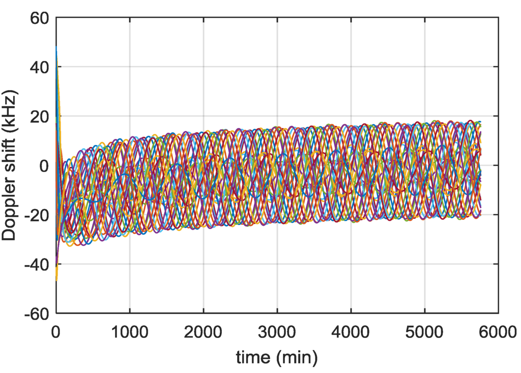According to Figure 7, the Doppler rate is less than 4 Hz/s after the initial few hours of the MTO. Therefore, during the first acquisition the frequency of the received signal may have shifted by up to 2700 Hz (4 Hz/s × 675 s). For the second acquisition, the frequency search space is then ±2700 Hz, which corresponds to NFB,2 = 217 frequency bins. The time to search the frequency search space of the second step is: