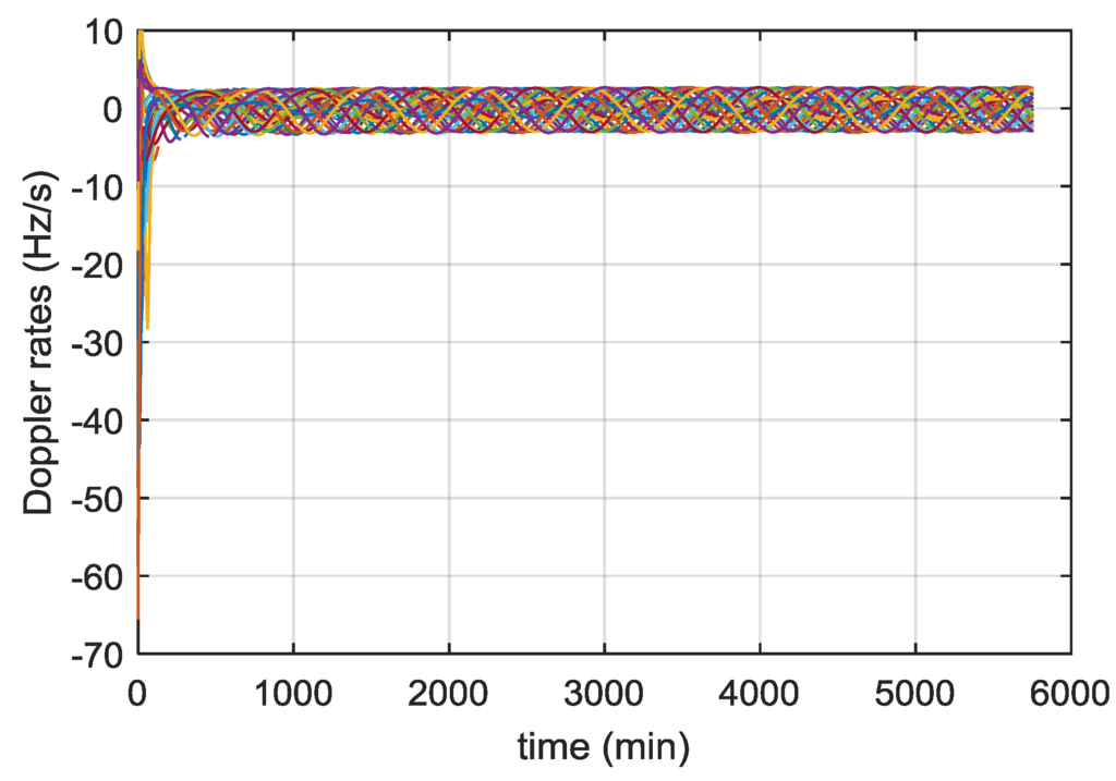 By time, we mean the time of week (TOW) from the navigation data. This can be delivered as the GPS week and seconds of the week. Provided the receiver is tracking at least one satellite above 15 dB-Hz the time can be decoded and considered to be known within 1 s. The rate of change of the Doppler frequency is up to 4 Hz/s according to Figure 7. Therefore, for 1 s of error in time, the corresponding error in the Doppler estimation is up to 4 Hz. Once a navigation fix is achieved, as we are using a stable OCXO our time knowledge will not drift quickly in periods of poor GNSS visibility (around 1 ms/day) and so is likely to be much better.
