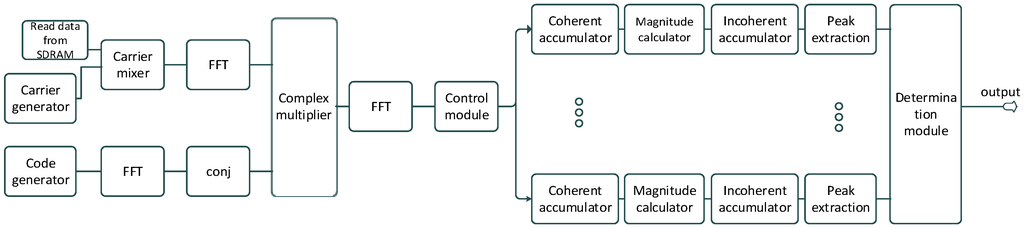 - Leclère, J.; Botteron, C.; Farine, P.-A. Comparison framework of FPGA-based GNSS signals acquisition architectures. IEEE Trans. Aerosp. Electron. Syst. 2013, 49, 1497–1518. [Google Scholar] [CrossRef]