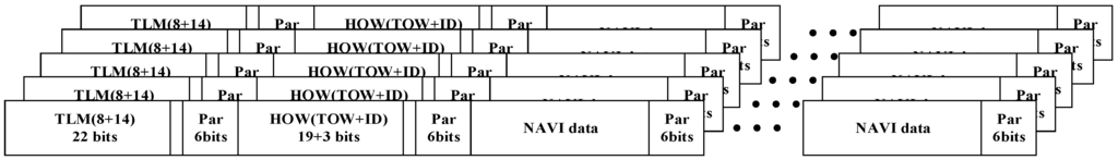 The data decoding procedure can be divided into two steps, the first step is frame synchronization (finding the preamble), the second step is to decode the desired data from multiple subframe repetitions. As depicted in Figure 10, each GPS frame contains 5 sub-frames. Every sub-frame has 6 s duration. It starts with a known 8 bit preamble and consists of 10 words. Each word has 30 bits. The preamble marks the beginning of each sub-frame and is repeated every 6 s.