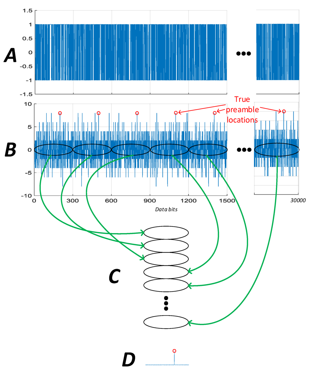 - Matrix C is generated by reshaping the correlation vector B into sub-frame length rows. Each column then represents a possible preamble location in the sub-frame. The size of this matrix is 300 × 100. The absolutes values of matrix C are then accumulated down the columns to form a vector D.