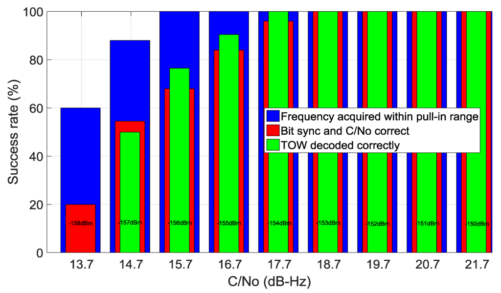 The success rate of the acquisition engine with signals of different carrier to noise density ratios (C/No) is shown in Figure 12. Here 25 trials were performed at each signal level and the success rate recorded for the acquisition, bit synchronization, and data decoding stages. The signals were generated with our Spirent GSS800 simulator and the output power is displayed in Figure 12. The decoding of the time of the week is used to determine if frame synchronisation was successful. Using typical derivations from [23,31] the detection threshold is chosen such that the probability of detection is theoretically 0.95 at 15 dB-Hz and probability of false alarm is 10−3.The acquisition results of Figure 12 are slightly worse but within 1 dB of the expected values. Clearly, the receiver is limited by its ability to synchronise and decode the navigation data before the acquisition limit is encountered. Despite this, at 15 dB-Hz the receiver is still able to acquire and decode the navigational data with a success rate of around 60% for each attempt.