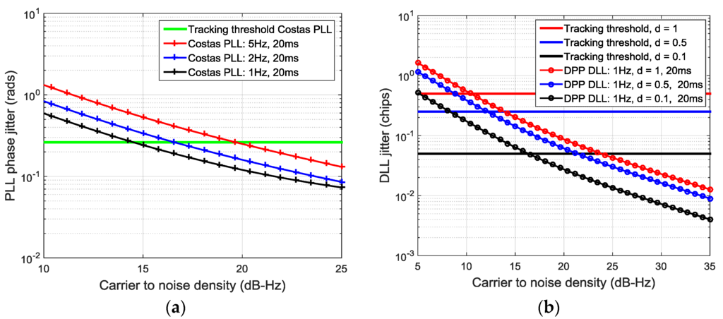 Typical expressions for the jitter of conventional GNSS tracking loop can be found in [23,32]. Figure 13a shows the expected PLL jitter and a conservative loss of lock threshold for a third order Costas PLL, assuming thermal and oscillator noise (based on the WeakHEO OCXO) are the only error sources and an integration time of 20 ms. This indicates that in the presence of navigation data flips we need to use bandwidth as low as 1 Hz to operate at 15 dB-Hz. The code tracking loop of the receiver is a first order loop aided by the carrier loop and uses a bandwidth of 0.1 Hz. Figure 13b shows the DLL jitter for the dot-product power discriminator with a 0.1 Hz, a 20 ms integration time and different early-to-late correlator spacing d. Correlator spacings of 0.25 chip or greater are required to maintain code tracking at 15 dB-Hz. If an adaptive spacing is used, smaller correlator spacings can be used at higher signal levels to reduce the pseudorange jitter. It should be noted that using such low bandwidths to improve the performance in weak signal environments lengthens the time between statistically independent measurements from the code and carrier loops [32]. This is not critical for this application. These low bandwidths are suitable for operation at altitudes significantly above the GNSS constellation; however, during the first part of the MTO the line-of-sight jerk can be as high as 6 ms−3. The received signal strength is far greater at this point but still requires a carrier loop PLL bandwidth of around 5 Hz to tolerate this jerk [32]. Therefore, when conventional approaches to GNSS tracking are used for this application the carrier loop bandwidth will need to be adjusted during the MTO.