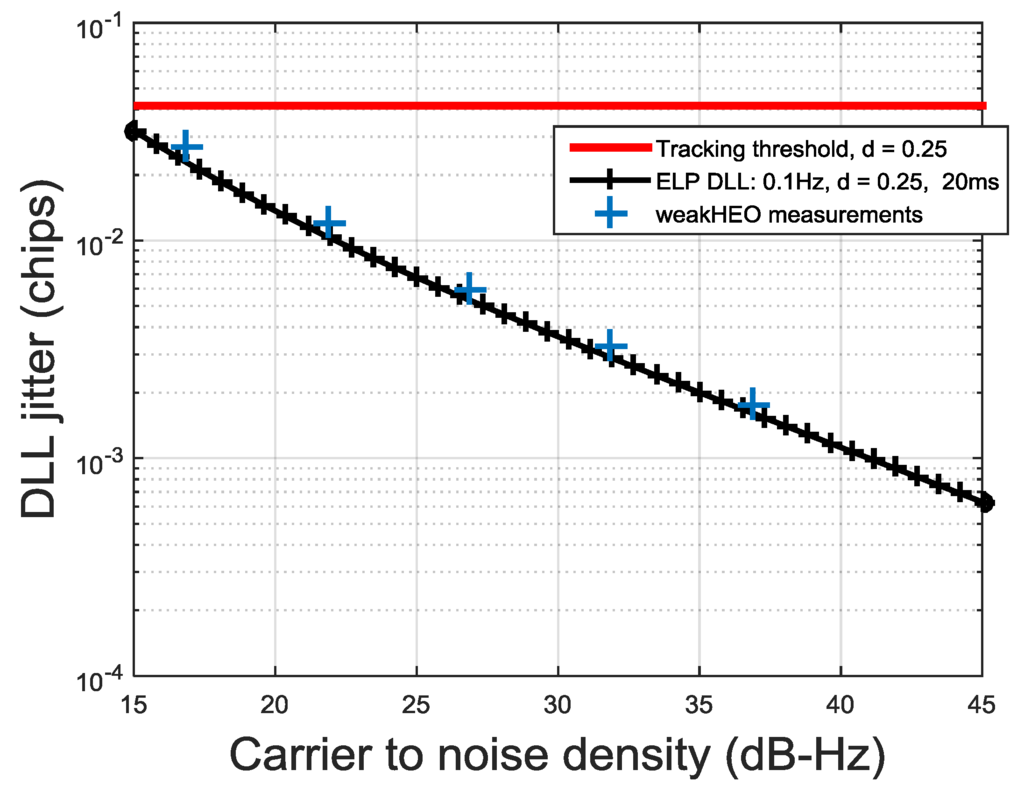 Figure 14 shows double difference measurements of the WeakHEO DLL jitter taking with our GNSS simulator with varying carrier to noise density ratios. Reasonable agreement with the theoretical values can be found.
