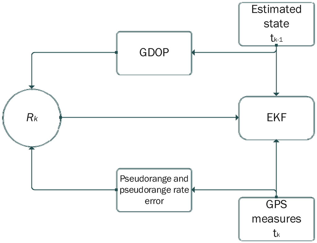 As described in [38], the covariance matrix R of the filter has to be adapted to the GPS measurements accuracy. Indeed, the R matrix is modelled as function of the GDOP multiplied by the estimated pseudorange error. The adaptive strategy is illustrated in Figure 15. From the estimated state computed at the previous time-step, the filter estimates the GDOP and the noise on both pseudorange and pseudorange rate measures to update the covariance matrix R.