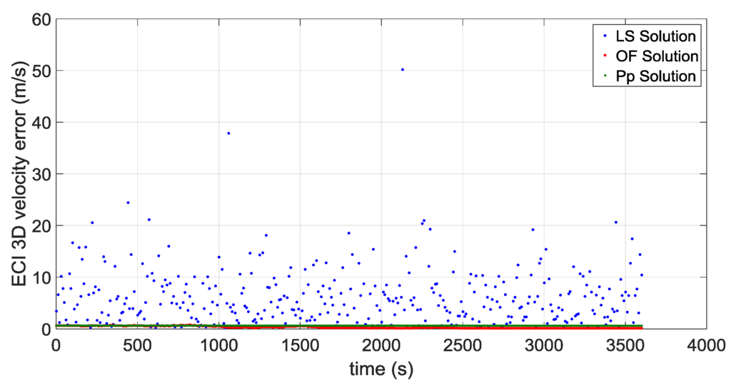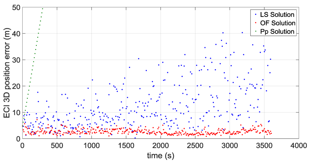An orbital filter has been implemented that integrates the GPS observations with an orbital forces model, by means of an adaptive Extended Kalman filter (EKF). The EKF integrates the least square single-epoch position and velocity solutions that are computed using the pseudoranges and the pseudorange rates output by the WeakHEO GPS receiver, together with the position and velocity predicted by an orbital forces model. The resultant filtered navigation solution can efficiently mitigate the effect of the very high GDOP and large ranging errors; indeed, it is significantly more accurate than the unfiltered least square single-epoch solution, as shown in Section 3. Thus, it can be used to aid the GPS receiver to acquire and track weak GPS signals while experiencing high dynamics. A detailed description of the orbital filter and its aiding to the acquisition and tracking modules can be found in [26]. In a different configuration, less simple but potentially more efficient, the EKF can integrate directly pseudoranges and pseudorange rates provided by the tracking loops together with their prediction provided by the orbital forces model. This has been investigated in our previous study [25], which also describes the performance of our orbital filter when it uses signals transmitted by the GPS-Galileo combined constellation. A comparison of the two configurations is described in [38].