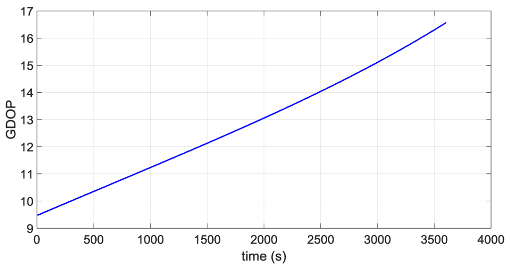 As described in [24] in detail, the achievable navigation accuracy at Moon altitude is strongly limited by a very poor relative geometry between the receiver and the transmitters (very large GDOP values) and large ranging errors. For instance, at Moon altitude, simulations in [26] show GDOP values much higher than 1000 for an acquisition sensitivity of 15 dB-Hz. Due to the very low carrier to noise ratio values, when processing GPS L1 C/A signals, the code tracking thermal range jitter can achieve values larger than 6 m [24]. A detailed characterization of GDOP and ranging error for different sensitivity values and different GNSS signals is provided in [24].