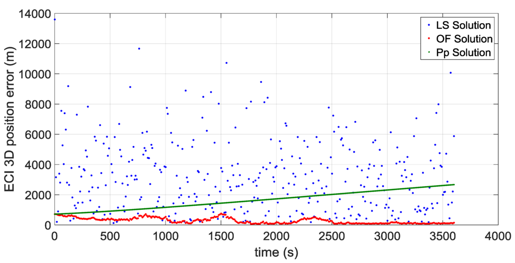 The performance will be further improved in the new “WeakHEO 2” version of our receiver, where the available hardware resources will be increased, allowing the integration of the navigation module into the processor within the FPGA. This will allow the orbital filter to provide aiding to the acquisition and tracking modules at a high rate to improve performance as shown in [26]. The orbital filter of the “WeakHEO 2” receiver will directly filter the raw pseudorange and pseudorange rate observations instead of the single-epoch least square solution, with an expected higher navigation accuracy also in case of less than four GPS observations available. In addition, the iteration rate of the navigation output will be increased from 0.1 Hz to 1 Hz and the number of tracking channel increased from 6 to at least 12 channels. Furthermore, in the future we will also consider processing other frequencies and signals of other GNSS constellations to further improve the overall performance.
