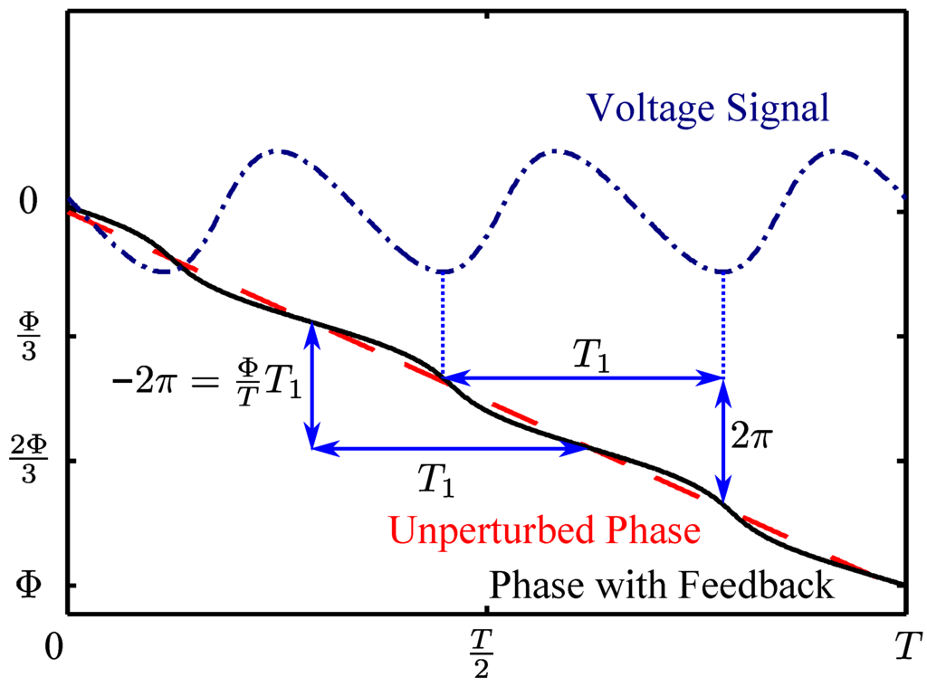 The value of can be obtained directly from the SM voltage signal, as we now explain. Suppose the period of the SM voltage signal is , as shown in Figure 2. From Equation (2) we see immediately that, for each period of the voltage signal, the phase changes by exactly . When , Equation (1) has only one solution [23]. Consequently, a change in of over a period necessitates the same change in in Equation (1), which we see from Equation (3) implies that , from which can be obtained. Note that it is straightforward to extract the period of the SM voltage signal by taking the overall average delay between successive peaks and successive troughs of the SM signals.
