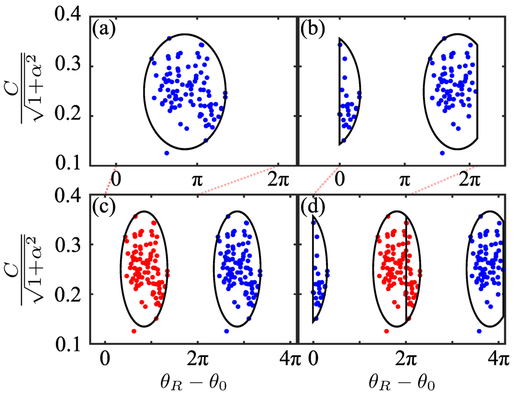 The two possible scenarios for the extracted phase distribution that can arise, yet still be resolved, are visualised in Figure 3. Figure 3a,b depict these possible point clouds of pairs. To automatically resolve this ambiguity for each material, we consider modulo (), and then duplicate the array phase-shifted by —. Considered together, the resulting array may contain either two clusters of points (the range of the fitted is within ), as in Figure 3c, or three clusters of points (the range of the fitted is not within ), as in Figure 3d.