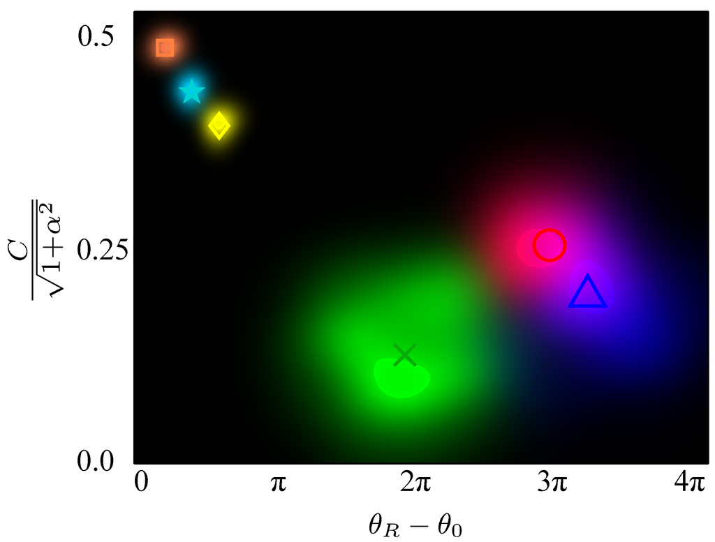Now we have determined a unique set of points (between 80 and 100 for the plastic explosives in this study) with phase spread distribution well within , and seek to extract a single pair of coordinates representative of the material under test. While the arithmetic average would be a natural choice for each coordinate in the pair, it is far too susceptible to outliers. Therefore, we opt for a measure of the centre of gravity of the point cloud obtained as follows. We apply the Mean-Shift algorithm iteratively [27,28] with a kernel chosen to be the reciprocal of the square of the Euclidean distance between the point pair and the previous iteration’s centroid (for the first iteration the arithmetic mean was used). Density plots for the selected cluster for each granular material, together with their centroid, are shown in Figure 4: METABEL, SEMTEX, SX2 (indicated by red, green, blue clouds and circle, cross, triangle markers, respectively). For comparison, we concurrently plot density plots for three homogeneous plastics: HDPE (High density polyethylene), PC (polycarbonate), HDPE Black (HDPE with black dye) (indicated by orange, cyan, yellow clouds and square, star, diamond markers, respectively). Note that the homogeneous plastics exhibit far less variability.