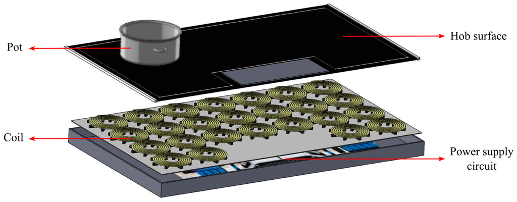 Although the idea of power transmission via electromagnetic waves goes back to the early 20th century [], induction systems have been most recently becoming increasingly more popular and crucial and their usage areas have been expanding because of their high efficiency and safety [,]. Today, in addition to melting, metal processing and wireless charging, induction cooking is one of the most important applications of induction systems. In induction hobs, coils are placed beneath the hob surface. These coils are fed by a supply circuit with an alternative current of frequency between 20 KHz and 100 KHz in general. Circulating currents on the coils produce magnetic fluxes and these magnetic fluxes couple to a vessel located on the hob surface. Therefore, in induction hobs, instead of conduction heat transfer, energy is transferred wirelessly from a coil to a vessel via electromagnetic fields. The transferred electromagnetic energy turns into heat on the vessel surfaces as a result of the induced eddy currents [,,,]. Accordingly, induction hobs are more efficient, non-hazardous and cleaner for users compared to conventional heaters including resistive and flame heaters []. In regular induction hobs, vessels should typically have similar sizes with those of coils and they should be placed right on top of a coil for efficient heating. To overcome these issues, induction hobs with an array of small-area coils have been proposed [,,]. Thanks to the array structure, efficient heating of vessels with different shapes and sizes located anywhere on the hob might be possible. Therefore, a very recent important implementation in induction hobs is all-surface heating [,]. Structure of an all-surface induction heating system is visualized in Figure 1.