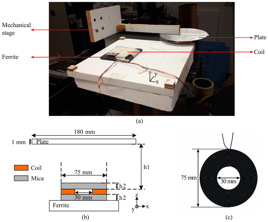 In our experimental study, a plate was used to be placed over a conventional circular coil and moved around horizontally without changing its perpendicular distance to the coil. Inductance and resistance values of the studied coil were measured for each position of the plate at two different frequencies (20 and 100 KHz) (by means of an LCR meter Agilent 4263B). Measurement setup is shown in Figure 2a. In experiments while the coil was immobile, the plate was systematically shifted on the x-y plane with the help of a computer-controlled mechanical stage. As a result, the changes of inductance and resistance values with an area of the coil covered by the plate were measured.