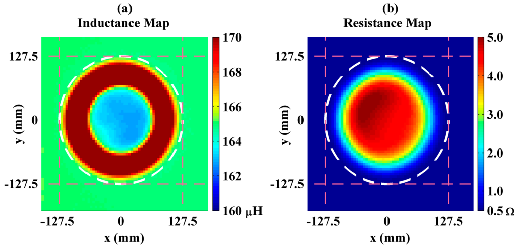Measured inductance (a) and resistance (b) maps for the system where the coil is loaded by the steel plate as a function of its lateral position at a horizontal plane 8 mm above the coil. Here, the coil is centered at the (0,0) origin. In addition, the white dash circles represent the points where the coil and the plate projections are tangential. End points of the circles are pointed out with pink ticks at −127.5 mm and 127.5 mm on the x and y axis.