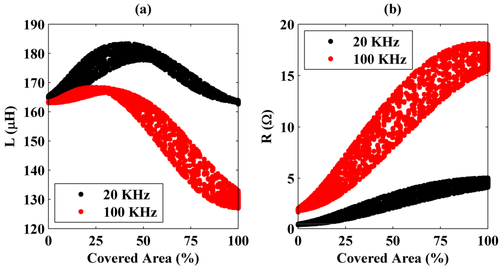 In the figure, it is seen that the system’s equivalent resistance has a trend of monotonically increasing, but the same behavior is not held for the inductance. In addition, variations in the inductance and resistance are higher at 100 KHz than those obtained at 20 KHz. Therefore, it can be deduced that, for the steel plate’s detection, the resistance should be considered rather than the inductance, and it is easier at high operation frequencies. In addition, in the figures, there exist multiple inductance and resistance values that correspond to constant covered area percentages. As explained previously, the reason for this measurement error is the plate’s not being completely parallel to the coil.