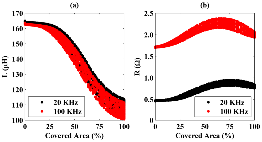 In the figure, a behavior different from that observed with the steel plate is expressed. Here instead of the resistance, system’s inductance has a monotonically decreasing trend with the covered area. Therefore, for the aluminum plate’s coverage detection, the inductance value should be considered rather than the resistance but high operation frequencies do not make this procedure easier. In Figure 5, the inductance does not change considerably with frequency. This is because of low magnetic permeability of the aluminum at 20 KHz and 100 KHz frequencies. Magnetic flux produced by the coil couples less to the aluminum plate.