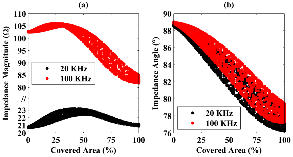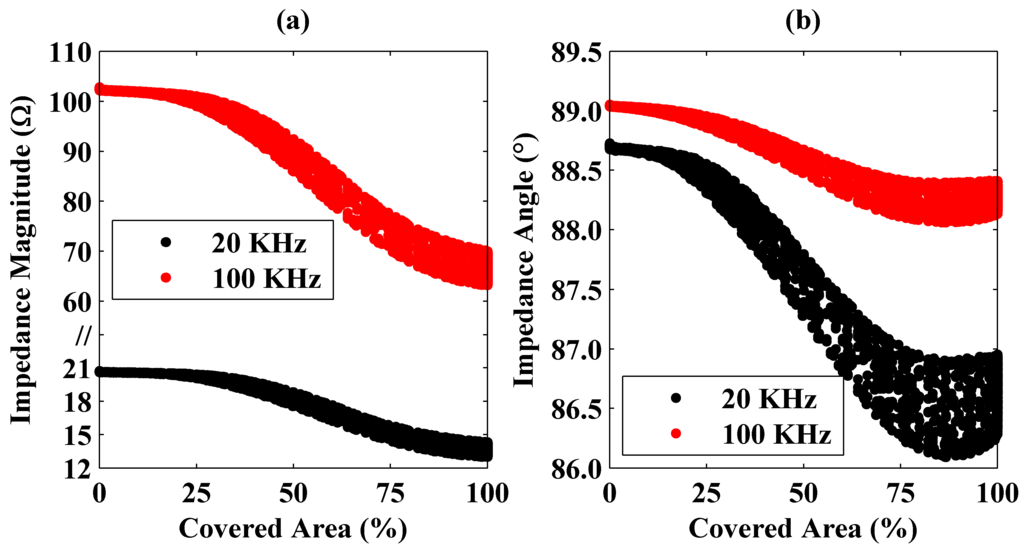 Changes of the impedance magnitude (a) and angle (b) at 20 and 100 KHz frequencies as a function of the coil area covered by the aluminum plate. Here, in part (a), the y axis is scaled nonuniformly for better representation of the calculated magnitudes at different frequencies.