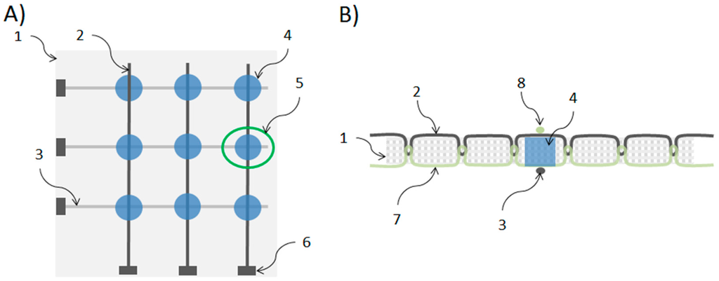 Scheme of a textile pressure sensor. (A) Top view of a 3 × 3 array where it is possible to identify: (1) base fabric, (2) top conductive path, (3) bottom conductive path, (4) conductive polymer treated zone, (5) single sensing element or sensel, and (6) connector or electrical contact for measuring; (B) Transversal view of a sensel (5 of panel A) illustrating the relation between the base fabric (1), the conductive threads (2 and 3), the non-conductive threads (7 and 8) and polymer-treated zone (4) that create the force-sensitive structure (the connector (6) is not shown in this view).