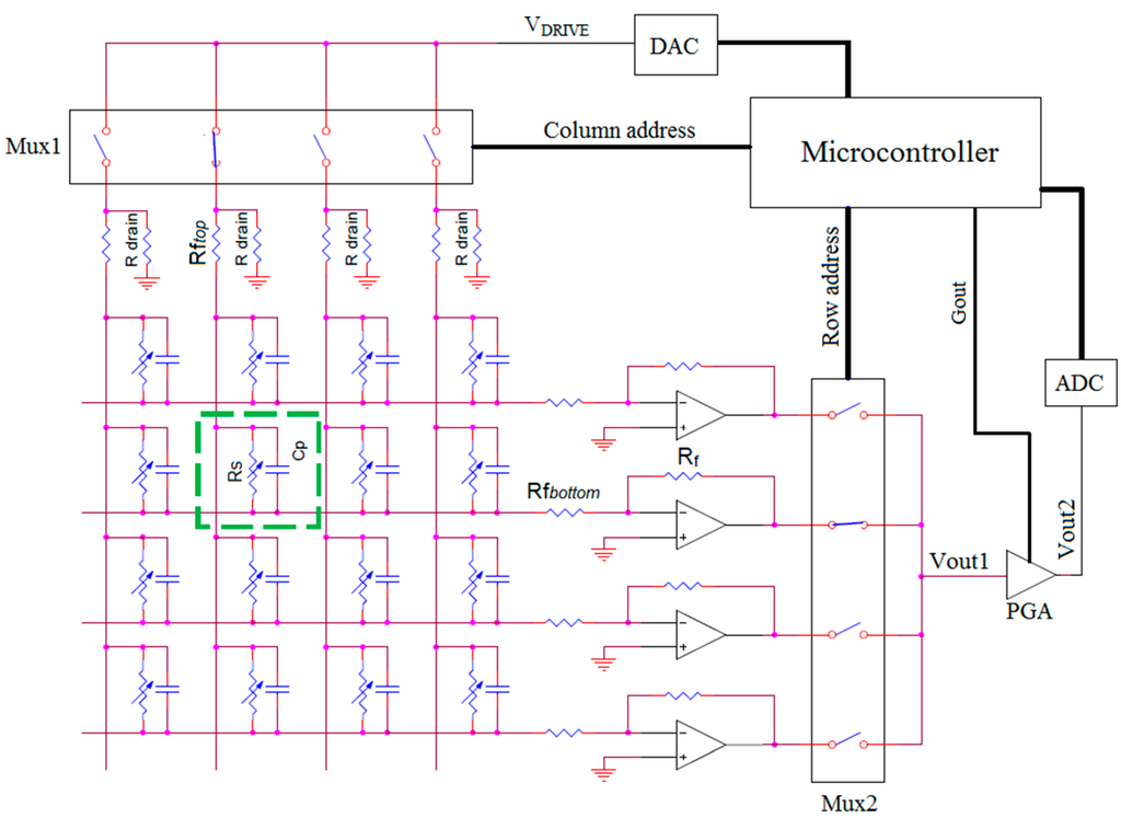- Operational amplifiers (MCP6V14—Microchip Technology) in transimpedance configuration: Transform into voltage the current of each row (bottom conductive paths) of sensels.