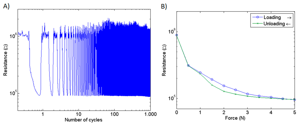 The resistive response of a single pressure-sensing element to a load of 5 N over 1000 cycles is shown in Figure 6A. Though the zero load resistance shows some variability, the response to the applied load is stable. In Figure 6B a typical loading-unloading curve is shown.
