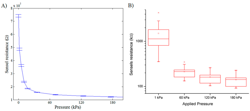 (A) Typical response of a single sensel of the mat prototype to the applied pressure. Error bars represent the standard deviation for three independent measures; and (B) boxplot that summarizes the response of 16 different sensels of the mat prototype.