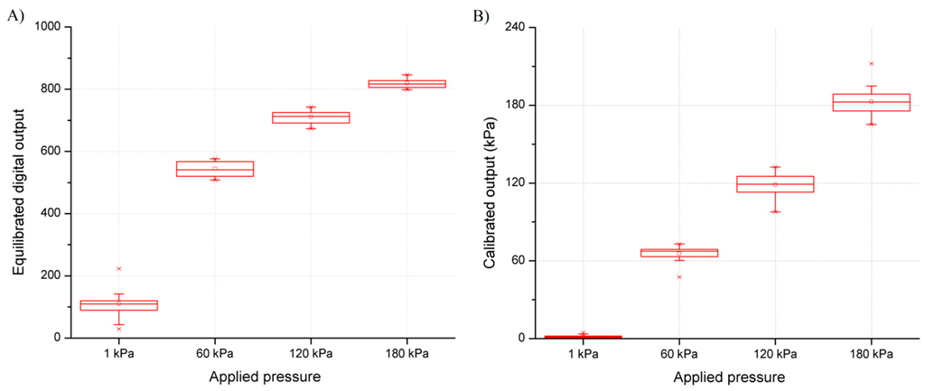 Boxplot of the equilibrated digital readout (A) and calibrated pressure output of 16 different sensels of the mat prototype (B).