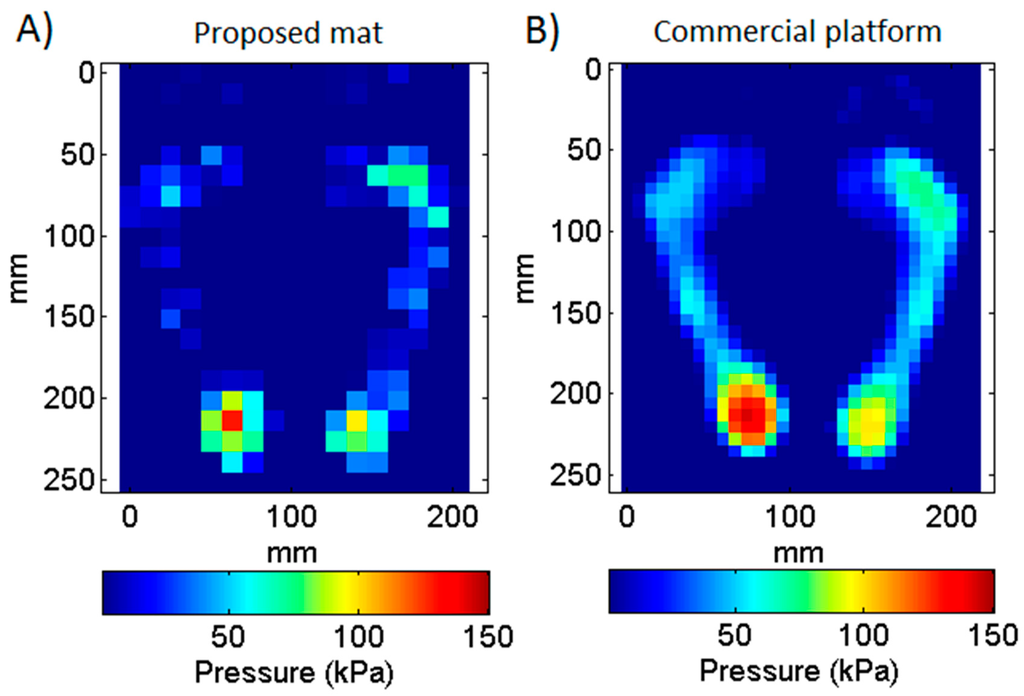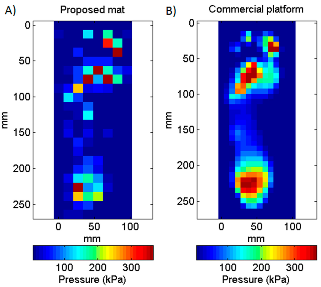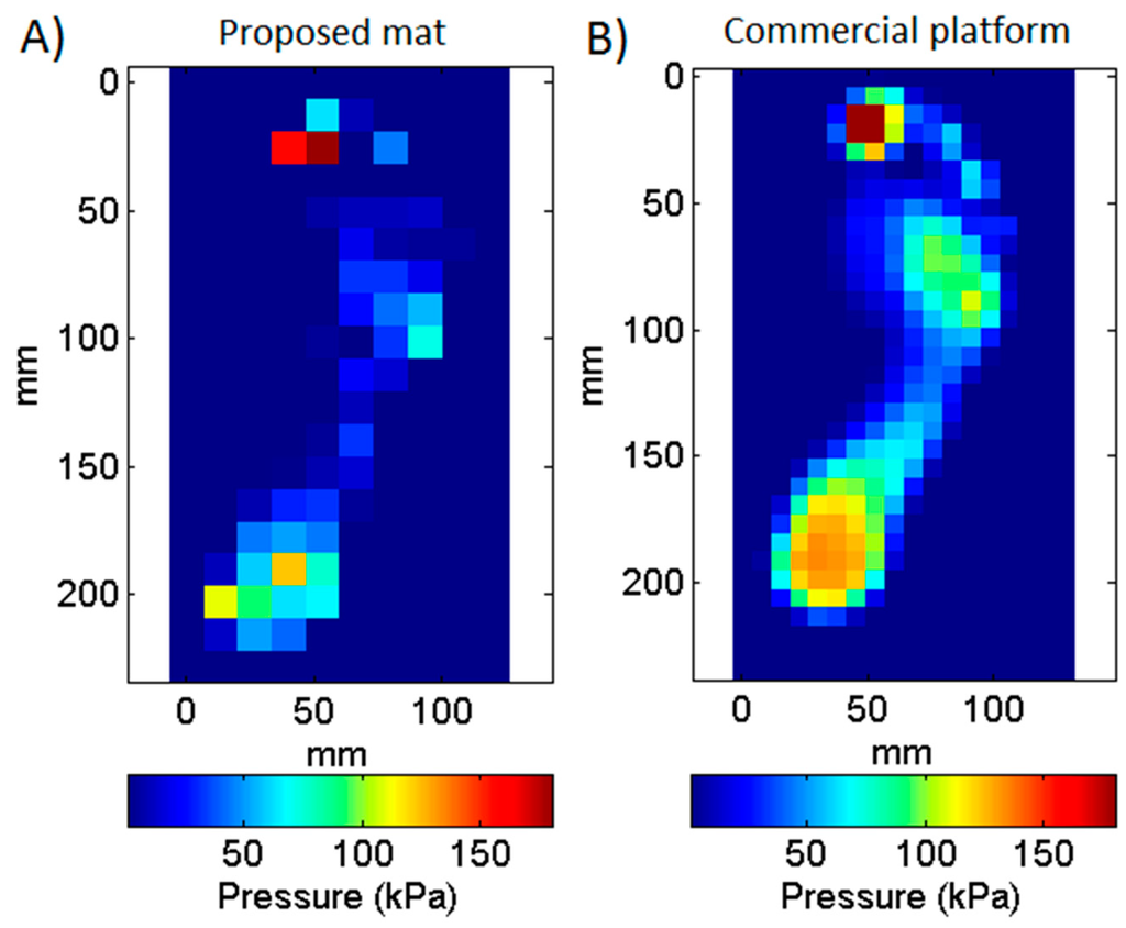 Comparison between two average plantar pressure maps acquired simultaneously with the proposed mat (A) and the commercial platform (B) during a unipedal standing trial. Maps represent the average pressure during a 30 s acquisition.