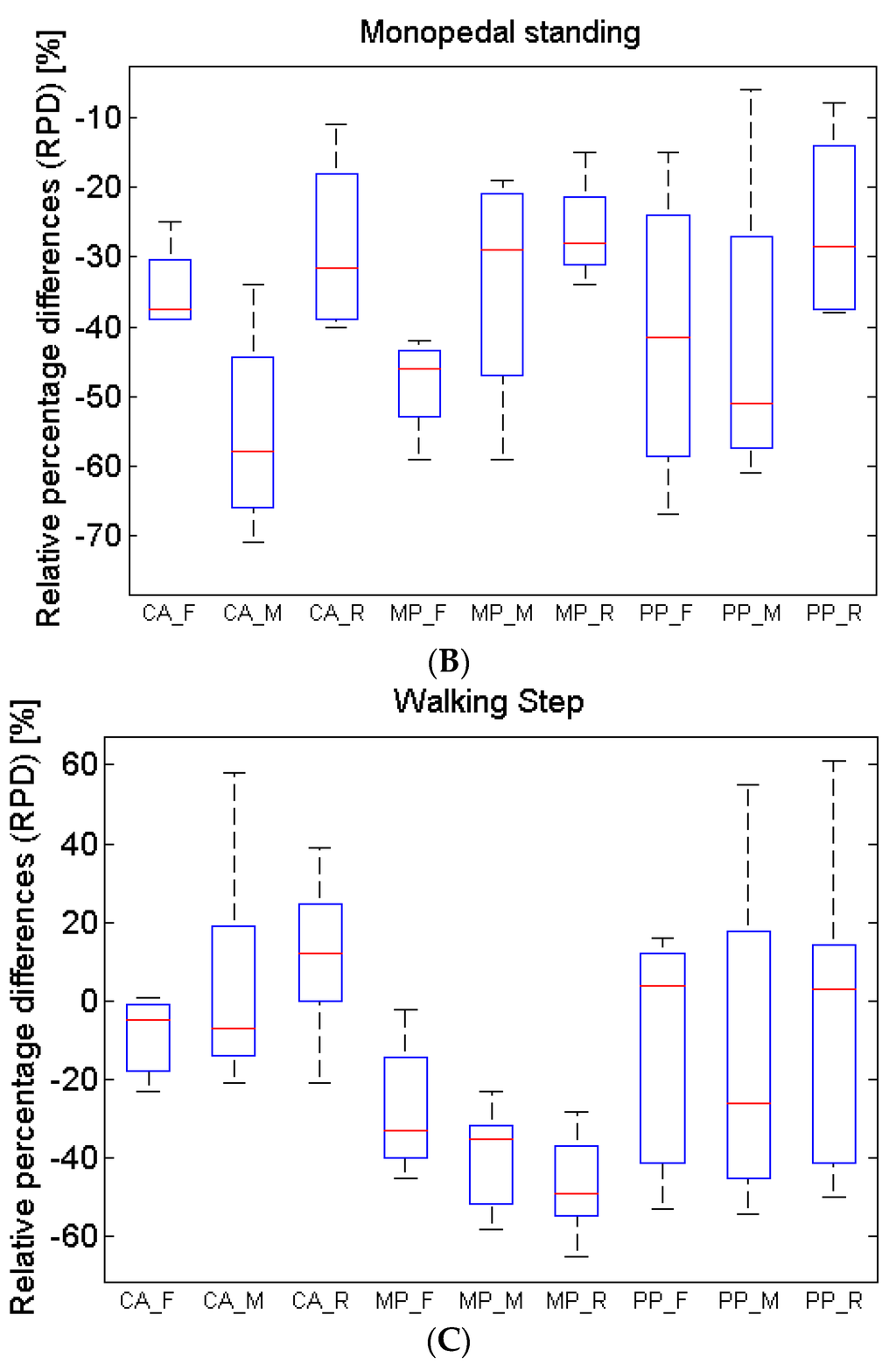 Boxplot of the relative percentage differences (RPD) obtained with each group of trials: bipedal standing (A), monopedal standing (B), and walking step (C). Individual boxplots are identified as CA-F (contact area of forefoot), CA-M (contact area of midfoot), CA-R (contact area of rearfoot), MP-F (mean pressure on forefoot), MP-M (mean pressure on midfoot), MP-R (mean pressure on rearfoot), PP-F (peak pressure on forefoot), PP-M (peak pressure on midfoot), and PP-M (peak pressure on rearfoot).