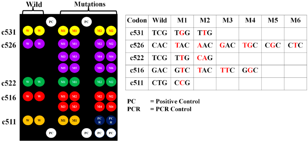 Respective positions of immobilized probes for codons c531, c526, c522, c516, and c511 (table on the right represents the corresponding wild and mutation sequence in these codons).