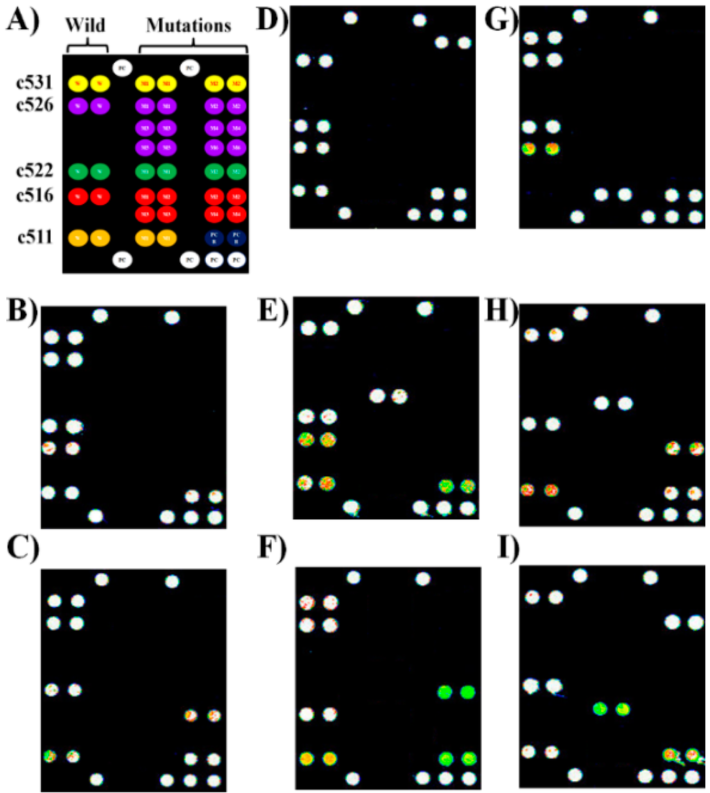Multiplex detection of mutation in the multiple codons of the rpoB gene of TB in the clinical samples by rifampicin-resistant M. tuberculosis (MDR-TB-RIF) 9G DNAChip. (A) Scheme depicting the positions of immobilized probes; (B) Wild sample; (C) c516 (GAC→GTC); (D) c531(TCG→TTG); (E) c526 (CAC→CGC); (F) c522 (TCG→TTG); (G) c511(CTG→CCG); (H) c526 (CAC →CGC) and c511(CTG→CCG) and c526(CAC→CAA); (I) c516 (GAC→GTC) and c526 (CAC→CGC).