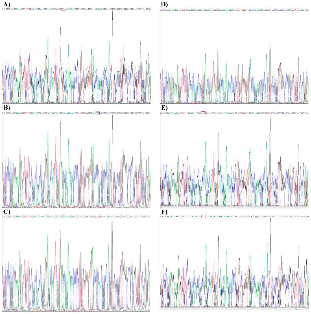 Examples of mutations identified by the sequencing analysis in the rpoB gene of TB in the clinical samples. (A) c516 (GAC→GTC); (B) c526 (CAC→CGC); (C) c531 (TCG→TTG); (D) c522 (TCG→TTG); (E) c511 (CTG→CCG); (F) c511 (CTG→CCG) and c526 (CAC→CAA).
