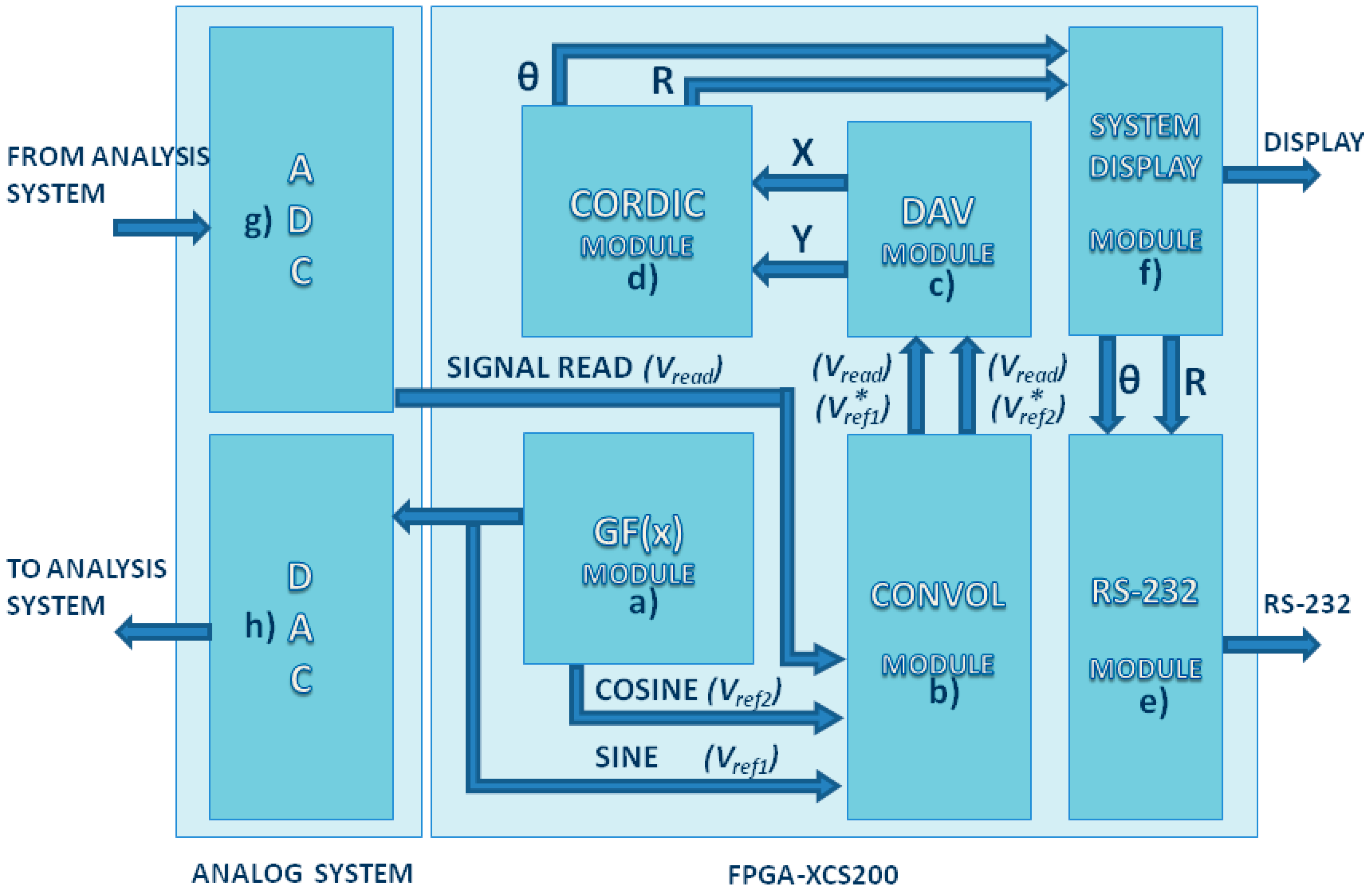 Complete block diagram: (a) Generation Function Module; (b) Convolution Module; (c) Dynamic Average Module; (d) CORDIC Module (e) RS-232 Module (f) System Display Module; (g) Analog to Digital Converter MAX1204; and (h) Digital to Analog Converter DAC0800
