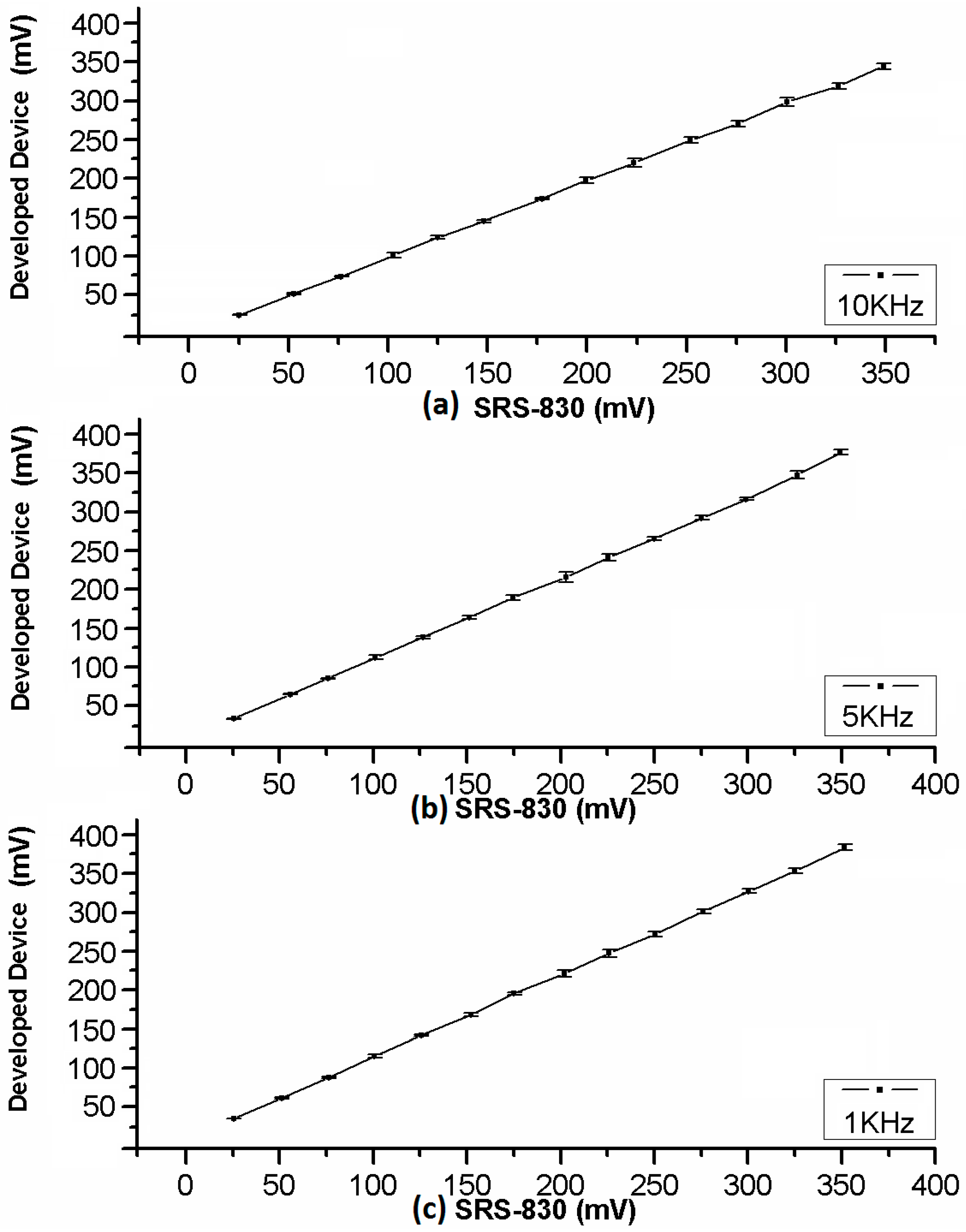 Amplitude detection response of the proposal versus SR830 LIA at different frequencies: (a) 10 kHz; (b) 5 kHz; and (c) 1 kHz.