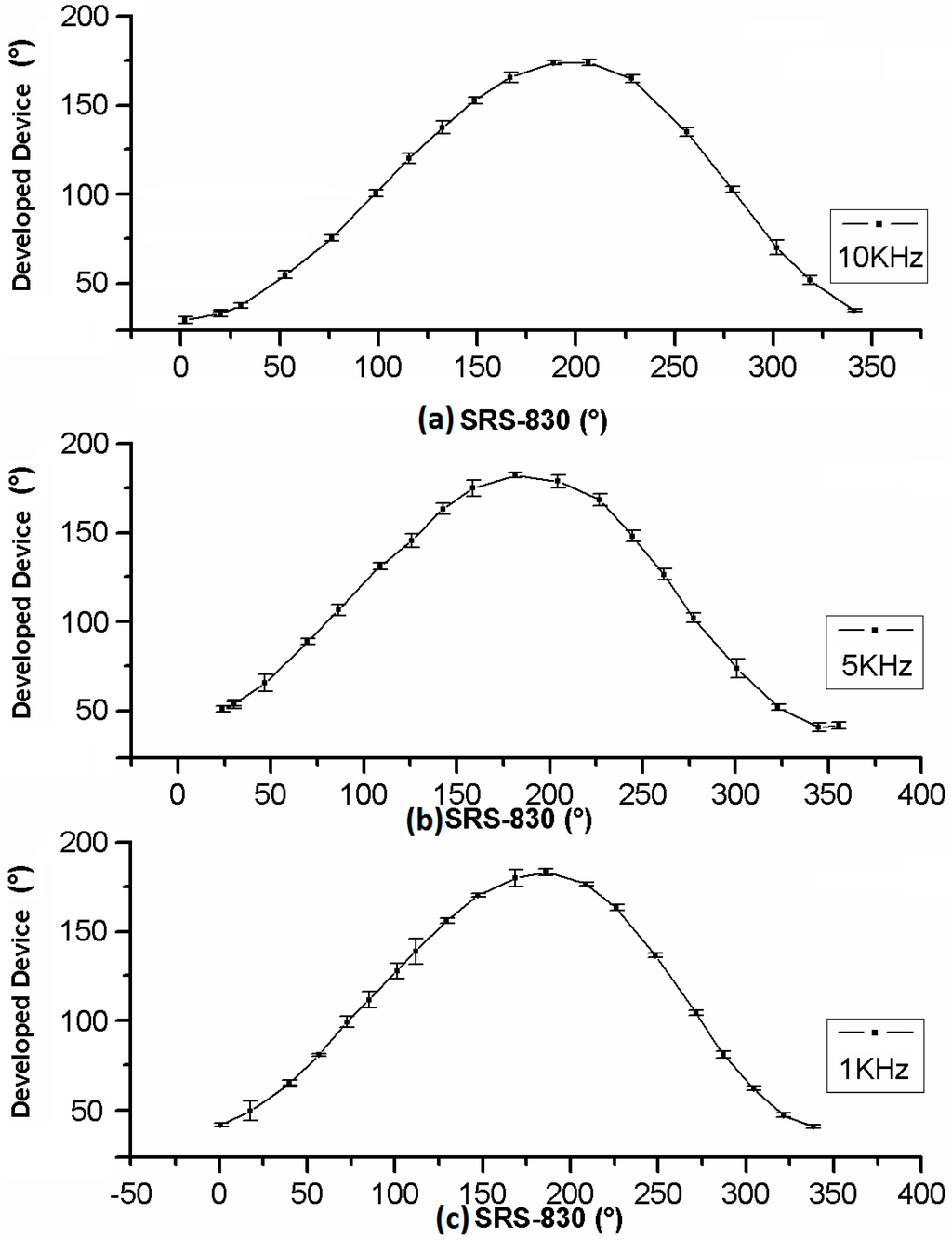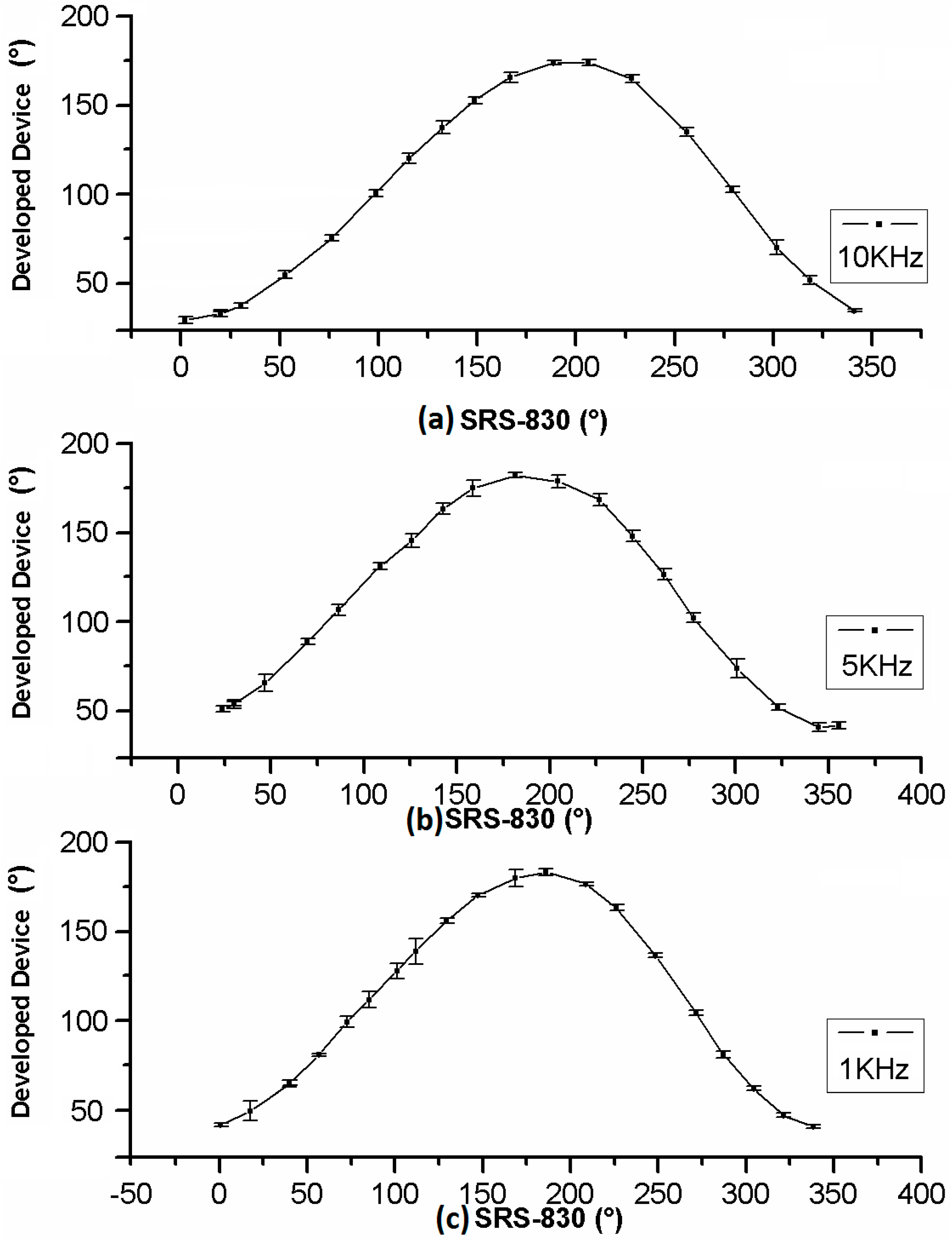 In the case of phase shift measures, they were carried out by a shift from 0 to 360° with 15° steps for three different frequencies: 1 kHz, 5 kHz, and 10 kHz. The phase shift obtained by the commercial LIA SR830 is graphed versus the phase shift obtained by developed device. The small variation in the measurements is also reflected in the small value of the standard deviation.