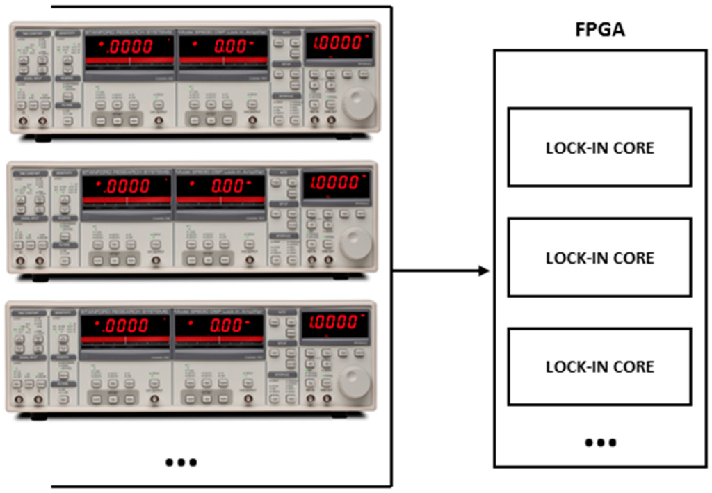 Many Lock-In Amplifier main functions (Developed Lock-In Core) can be implemented in the same FPGA circuit depending on the Logic Cells availability from the used circuit (SR-830 Lock-In Left Image from Thinksrs.com, (Sunnyvale, CA, USA).