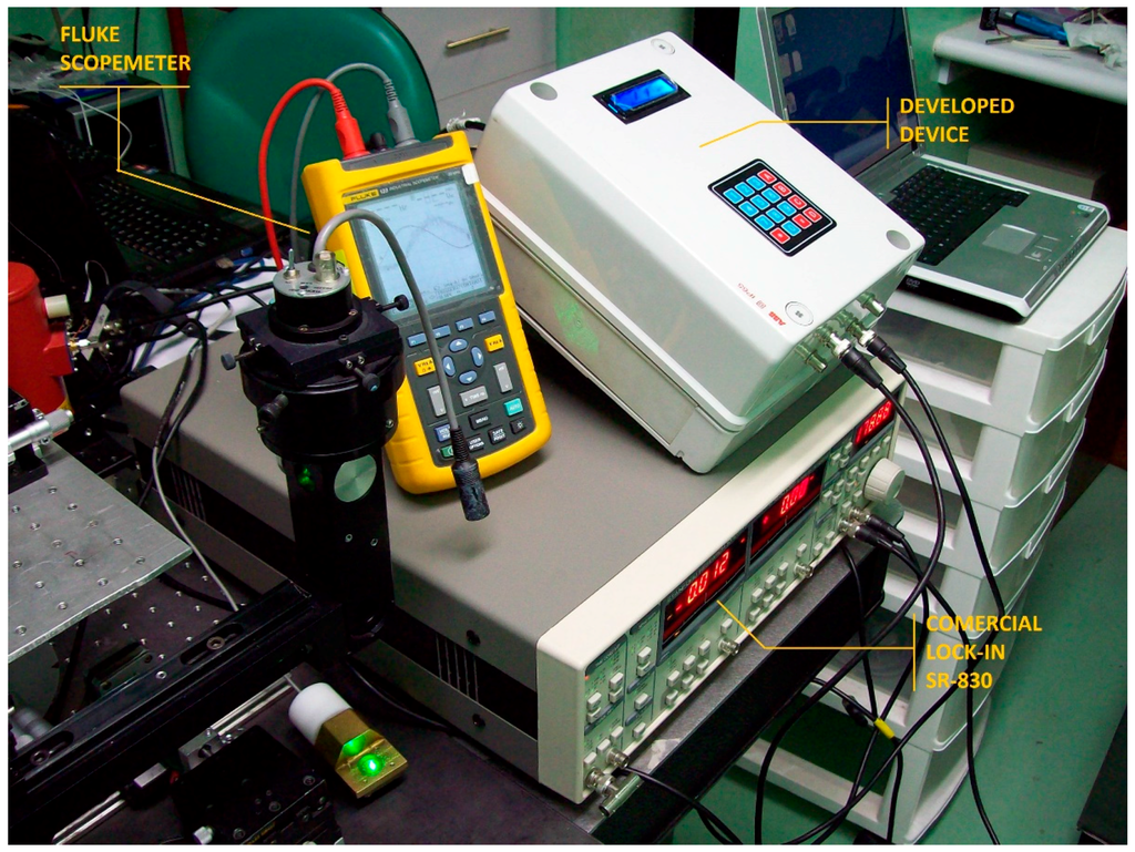 Researchers have developed hardware for some specific Lock-In applications. Barragan, et al. [5] presented a Lock-in based on a Digital Signal Processor (DSP) for optical attenuation measurement; his implemented device may work in a 0–20 kHz range. Rastelli [7] developed a Field Programmable Gate Array (FPGA) based Lock-in for high frequencies, in this case, the specific purpose was photon counting. The aforementioned confirms that PSD development for some specific application is very important. It also reduces some problems, such as large space needs, unnecessary electronic functions, and high hardware costs, among others [5,7].