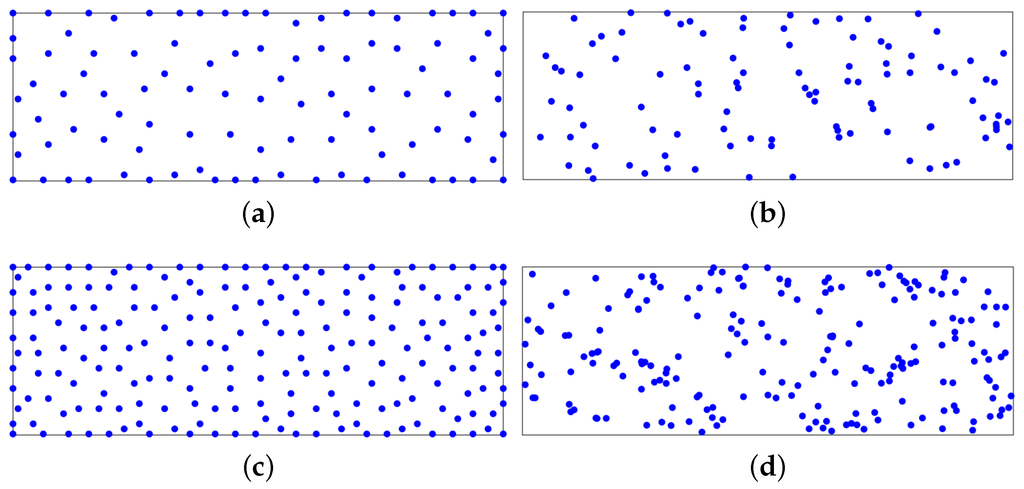 To illustrate MID, we consider an area P of 19.5 m × 48.5 m and m. Figure 2 shows the positions of the RPs in when and 200 RPs are selected out of the virtual sample database . Further, Figure 2 shows the positions of the RPs when the RPs are selected randomly from .