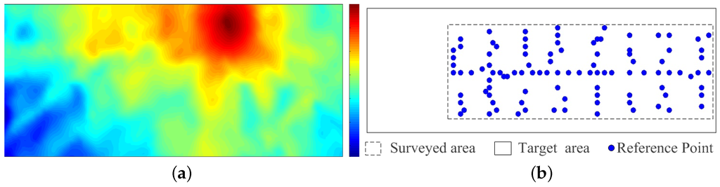 True radio map and the distribution of RPs. (a) True Radio map of the whole target area; (b) Distribution of Reference Points.