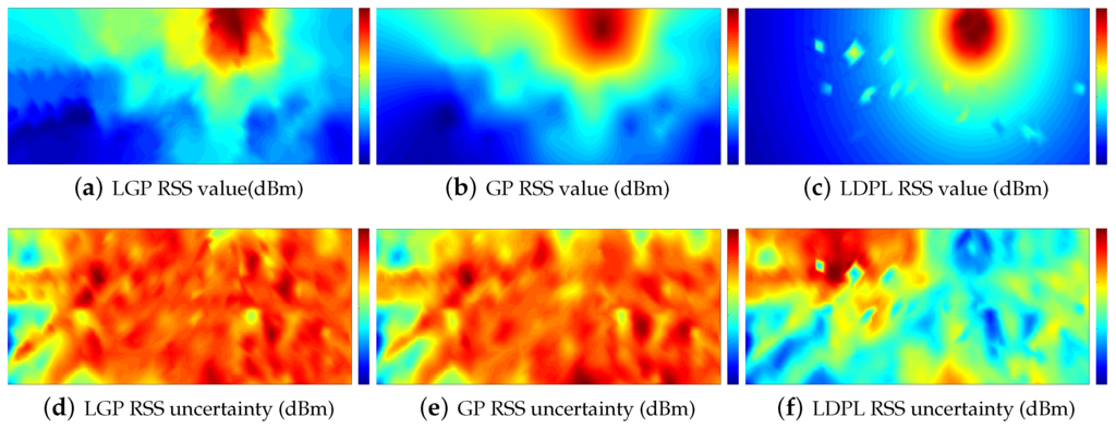 There are some algorithms can be applied to build the radio map rapidly presented in Section 2, such as crowdsourcing, ray-tracing, SLAM, and mathematical models. We did not supply enough comparison with all of these techniques because different algorithms rely on different equipment and input. It is not straightforward to make comparisons between different algorithms in different conditions. Our study mainly focuses on the mathematical model. As a result, we only make comparisons between the widely used mathematical models, including Gaussian Process (GP) and Log-Distance Path Model (LDPL). Figure 4 is the simulation result. During the simulation, we set , , , and . In the Log-Distance Path Model (LDPL) [36], where the parameters of the LDPL model are estimated based on the training data, the uncertainty of RP i is defined as follows:
