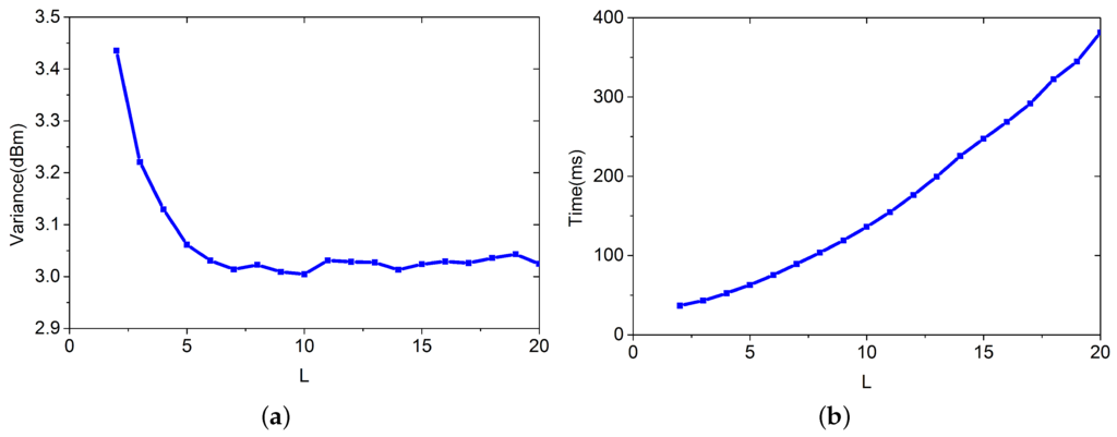 In this simulation, L increases from 2 to 20. In Figure 5a, we can see that the variance decreases as L increases. Figure 5b shows the time complexity increase with L. If we want to keep a good balance between time complexity and variance, we can set .